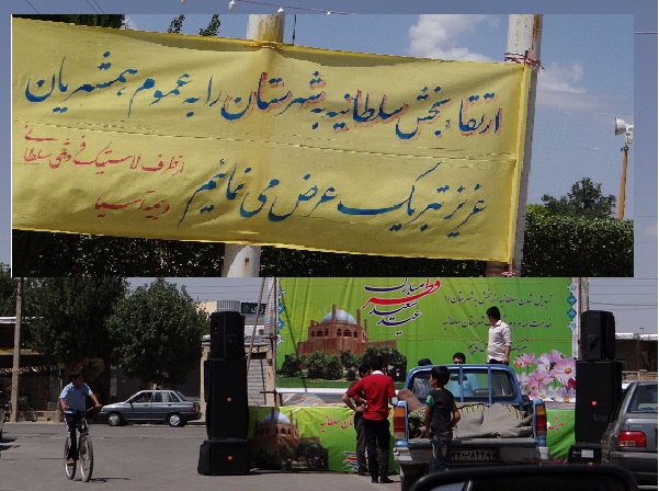 نکته جالب اینکه رفتن ما به آنجا مصادف شده بود با تبدیل شدن سلطانیه از بخش به شهرستان که مردم آنجا خیلی خوشحال بودند و بنر و پلاکارد تبریک از طرف بنگاهی و لاستیک فروشی و... بود که به در و دیوار چسبانده بودند و باندهایی که در مرکز شهر گذاشته بودند و صدایش از چند کیلومتری شنیده می شد. این هم عکس چندتاش: